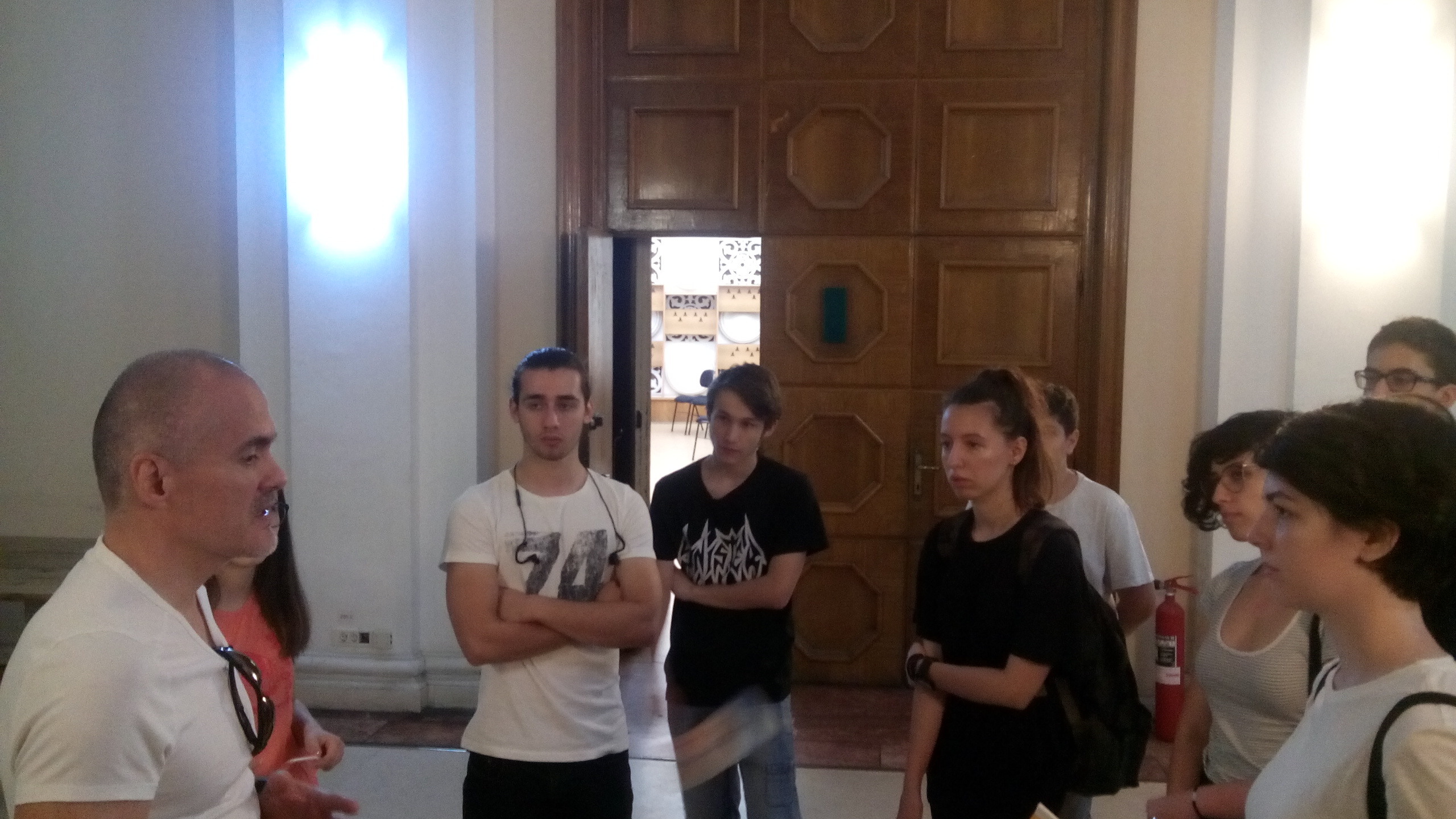 Încercând să adunăm cât mai multe informații pentru viitorul nostru mic studio radio, am început vizita la Sala Radio cu mult optimism legat de relația dintre tineri și radio și anume în singurul studio de teatru radiofonic din România - Studioul Mihai Zirra, unde, pentru un concurs între mai multe licee din București, câțiva elevi înregistrau o piesă de teatru. Astfel, am aflat cât de greu este să petreci atât de mult timp într-un studio de teatru, întrucât acolo orice sunet în plus, oricât de mic, nu este deloc bine-venit.